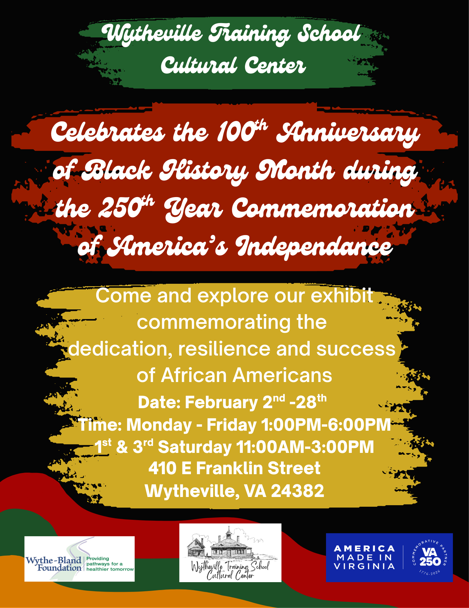 This is an invitation to Learn, Reflect, and Celebrate. The Wytheville Training School Cultural Center welcomes residents, families, students, and visitors to explore this inspiring exhibit. Whether you seek to learn something new, honor the past, or spark meaningful conversations, this celebration of Black history promises to be both educational and deeply moving. Together, let us commemorate a century of Black History by celebrating the individuals whose courage and brilliance helped shape America.