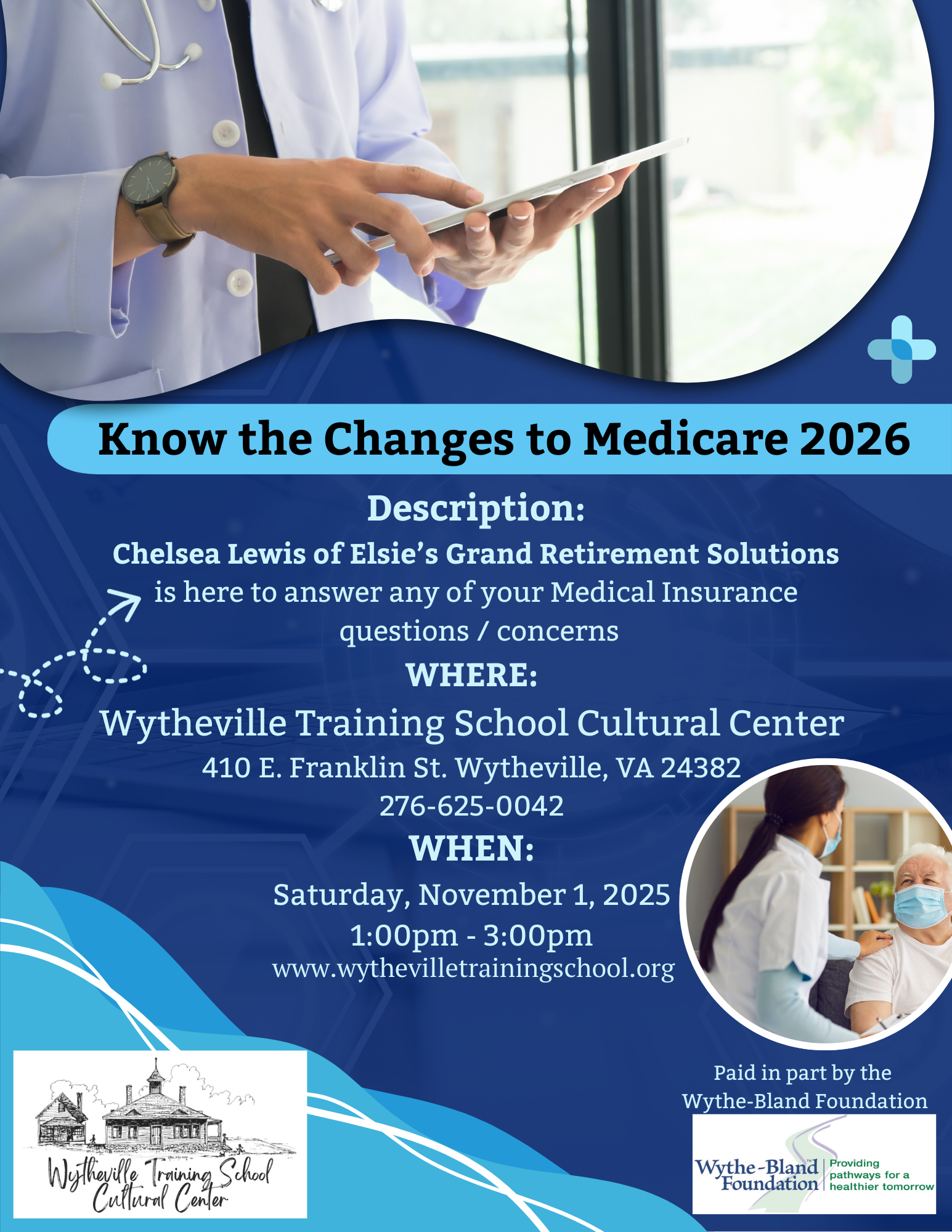 Know the Changes to Medicare 2026 Saturday, November 1, 2025 1:00 PM 3:00 PM 13:00 15:00 Wytheville Training School Cultural Center 410 E. Franklin St Wytheville, Virginia, 24382 United States (map) Google Calendar ICS