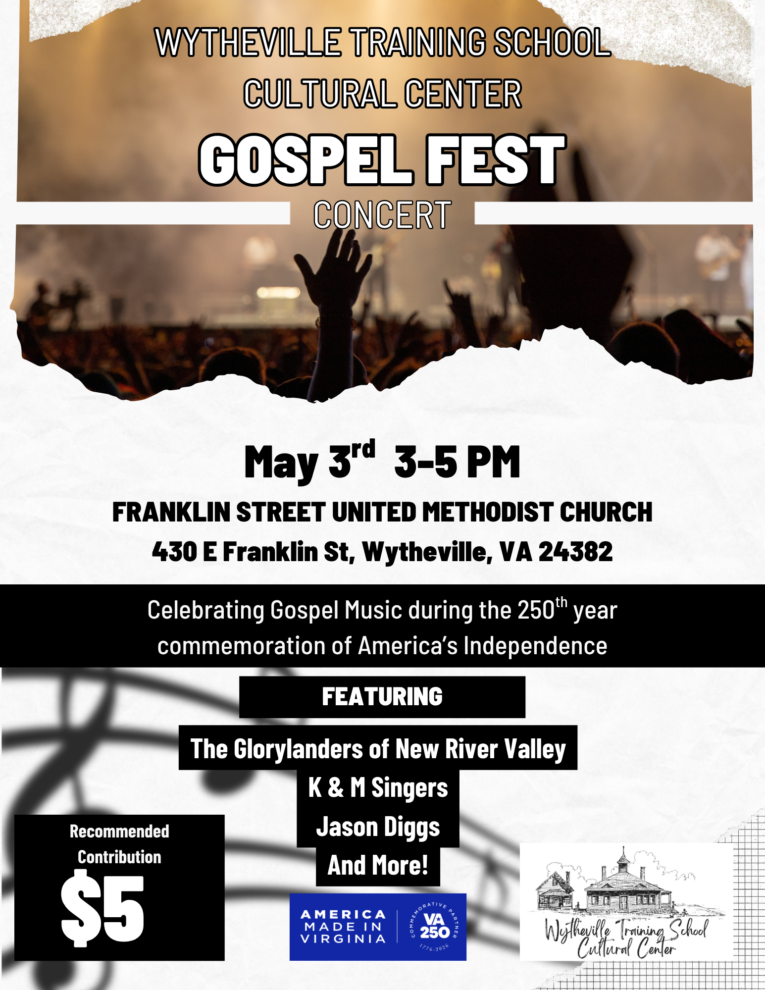 The Wytheville Training School Cultural Center, in partnership with Made in America VA 250, will host a community Gospel Fest Concert on Sunday, May 3, 2026, from 3:00 to 5:00 p.m. at Franklin Street United Methodist Church, 430 E. Franklin Street in Wytheville. The event is part of the region’s observance of America’s 250th anniversary and highlights the rich, multicultural sacred‑music traditions that have shaped Southwest Virginia for more than two centuries